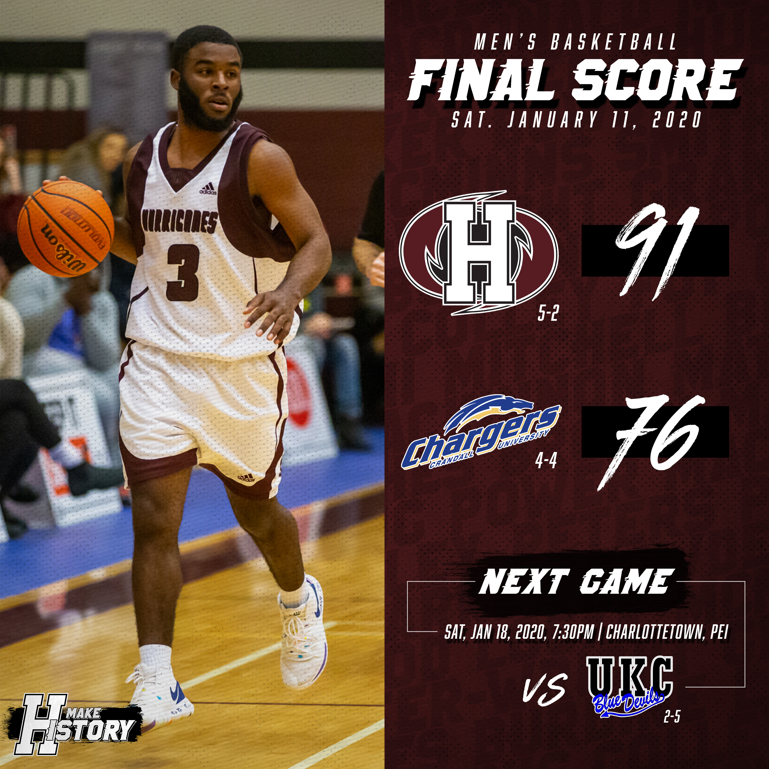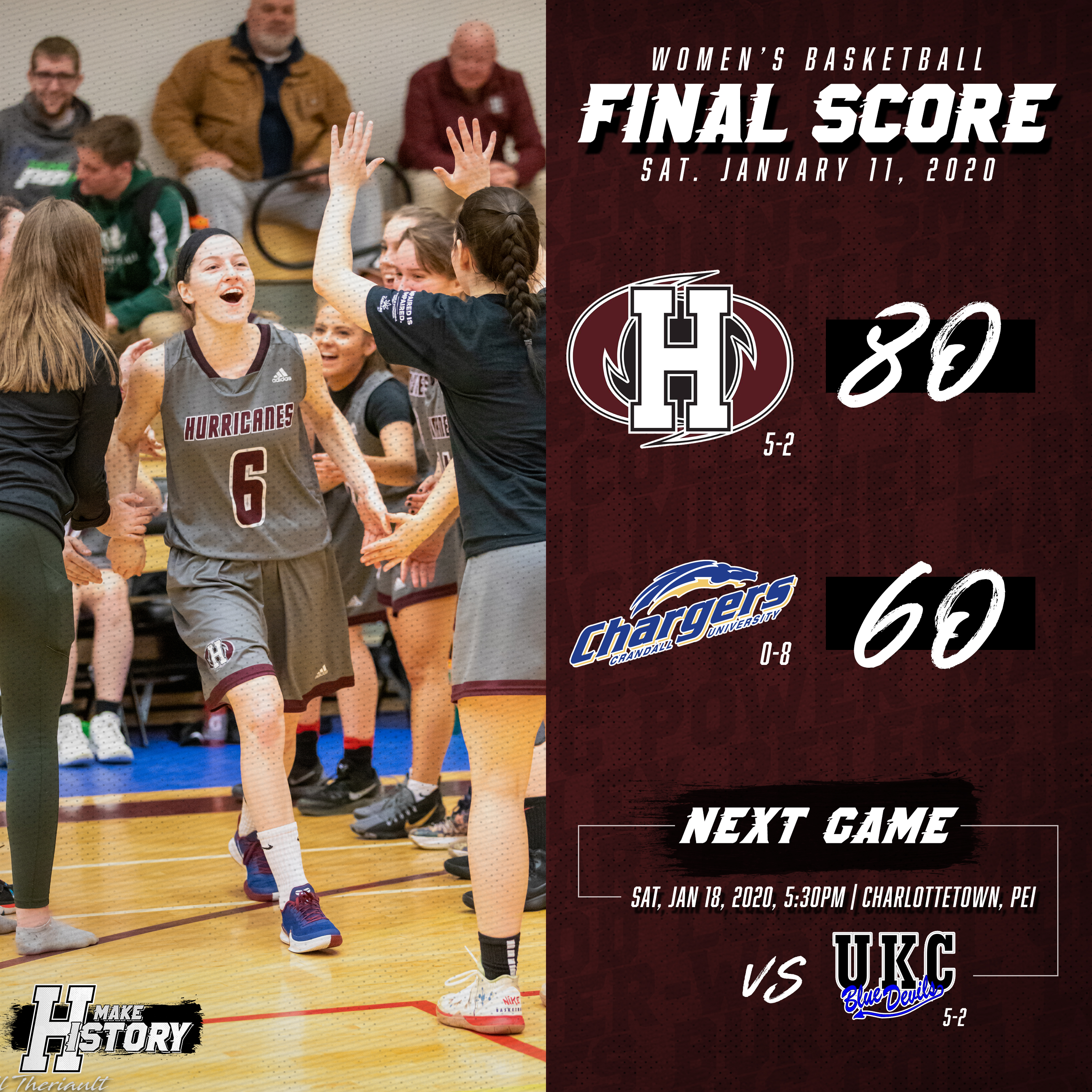With the victory the Hurricanes improve to 5-2 on the season and are tied with the University of King’s College (UKC) Blue Devils for second in the ACAA, while the Chargers remain in eighth place, dropping to 0-8.