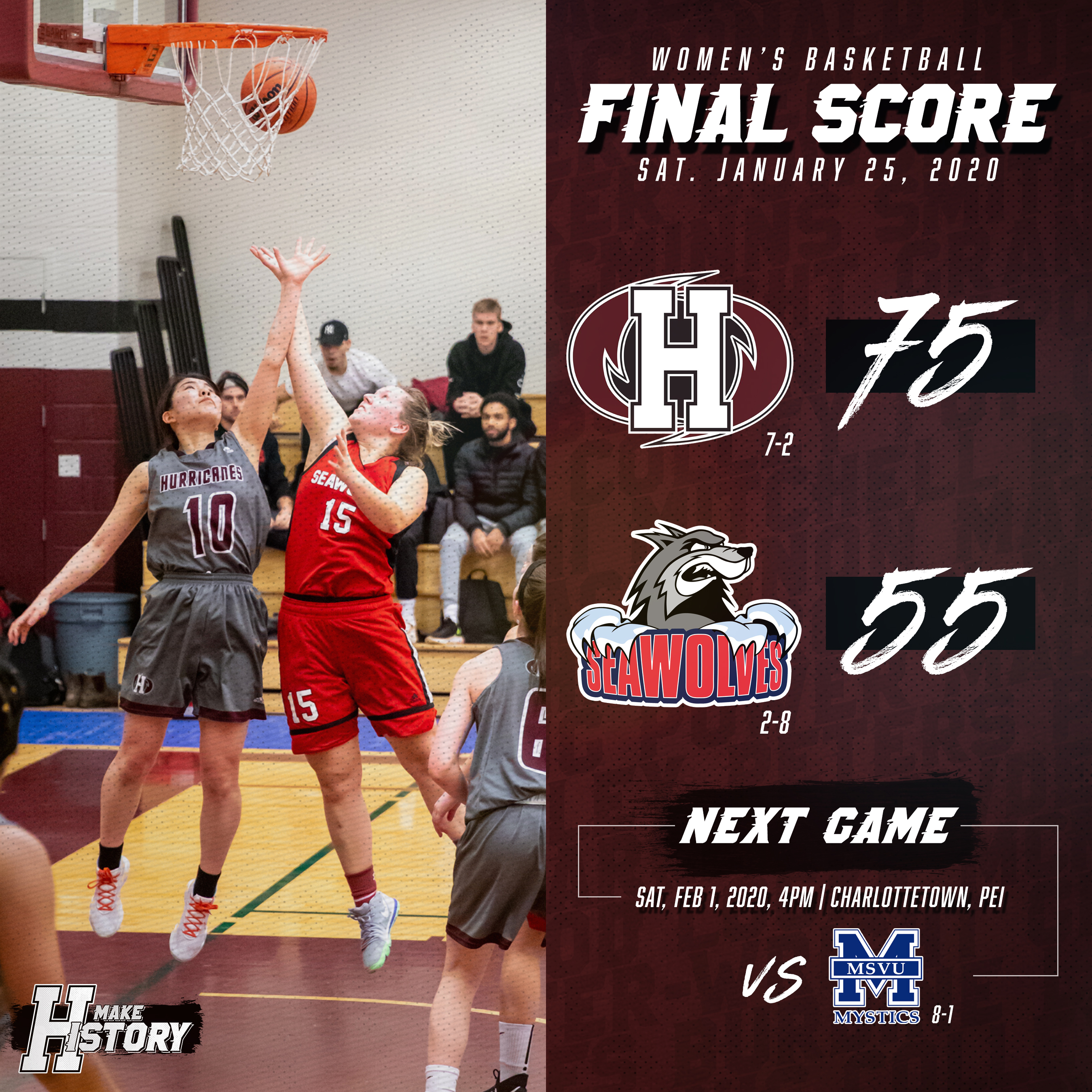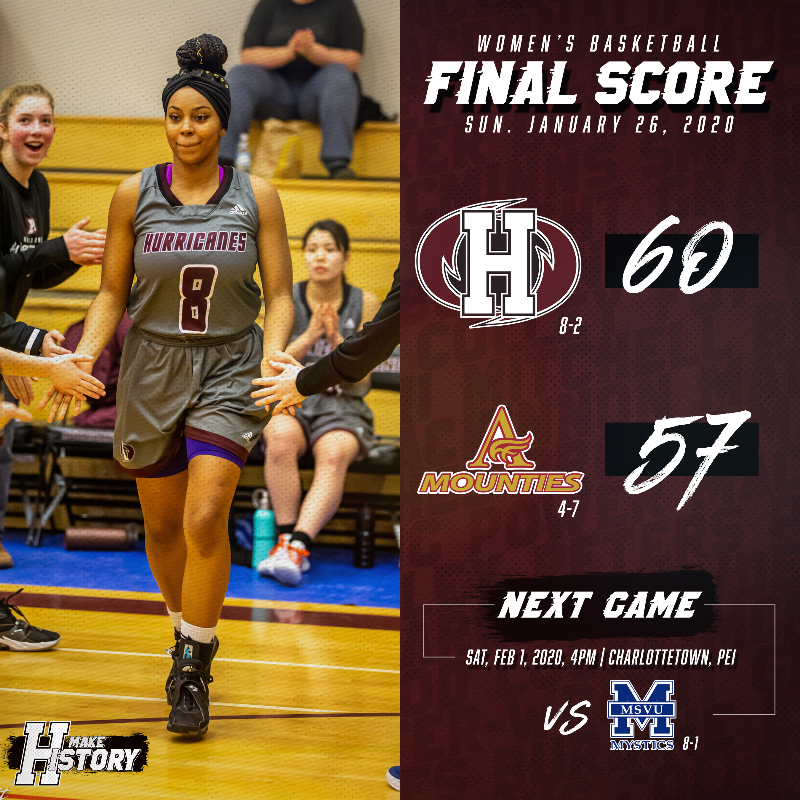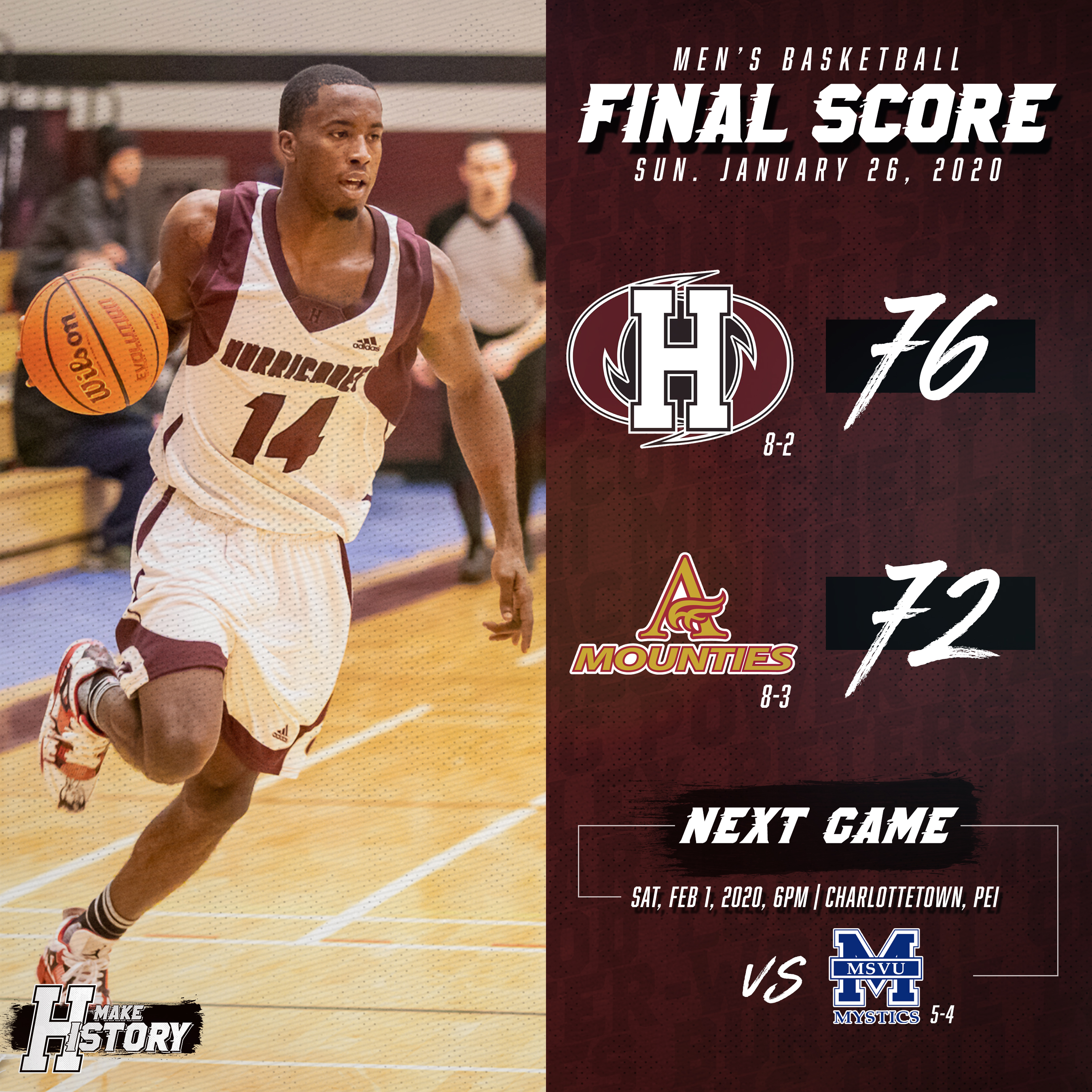 The Hurricanes will return to the court on Saturday, February 1 versus the Mount Saint Vincent University (MSVU) Mystics at the Holland College CCE in Charlottetown. The women’s Mystics enter the weekend at 8-1 and in a tie for first place with the ‘Canes while the men’s team from MSVU is in fourth at 5-4 this season.