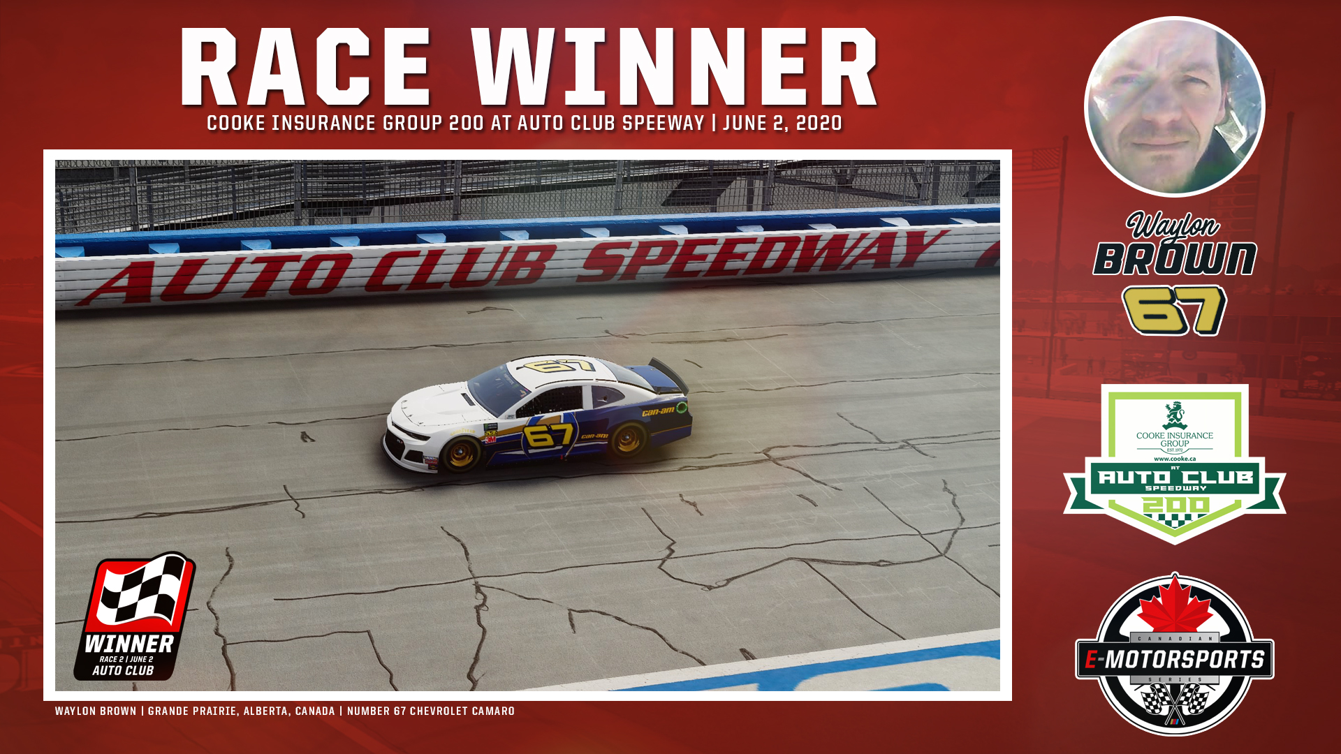 The Canadian eMotorsports Series travelled to the virtual-Auto Club Speedway on Tuesday night for the second stop in the 2020 regular season, the Cooke Insurance Group 200.