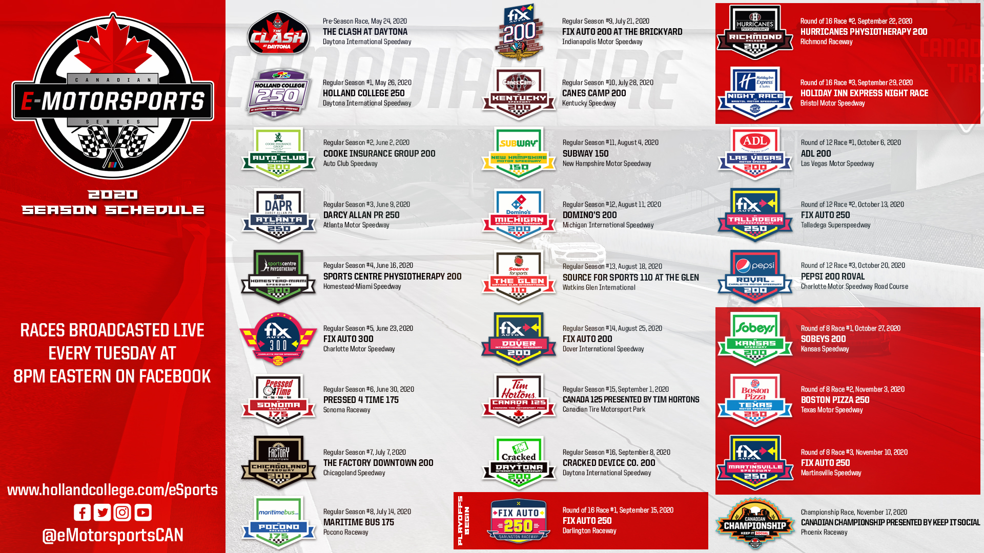 Don’t miss a minute of the action on May 24 and 26 from Daytona International Speedway by watching The Clash and the Holland College 250 live at www.facebook.com/eMotorsportsCAN with the broadcasts starting at 7:30pm eastern.