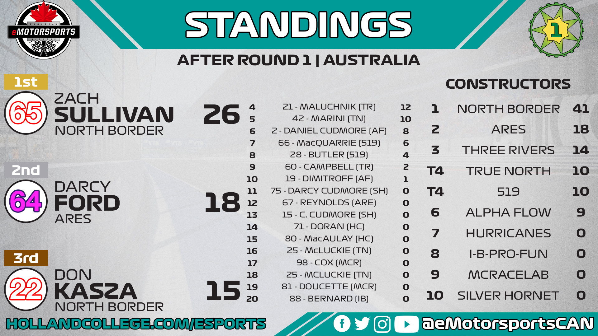 Kasza completed a double-podium performance in Australia for North Border Racing with a third-place finish, giving the team an early lead in the Constructors Championship with 41 points. They enjoy a 23-point cushion over Ares Racing, with all 18 Ares points coming from Darcy Ford’s second-place finish.