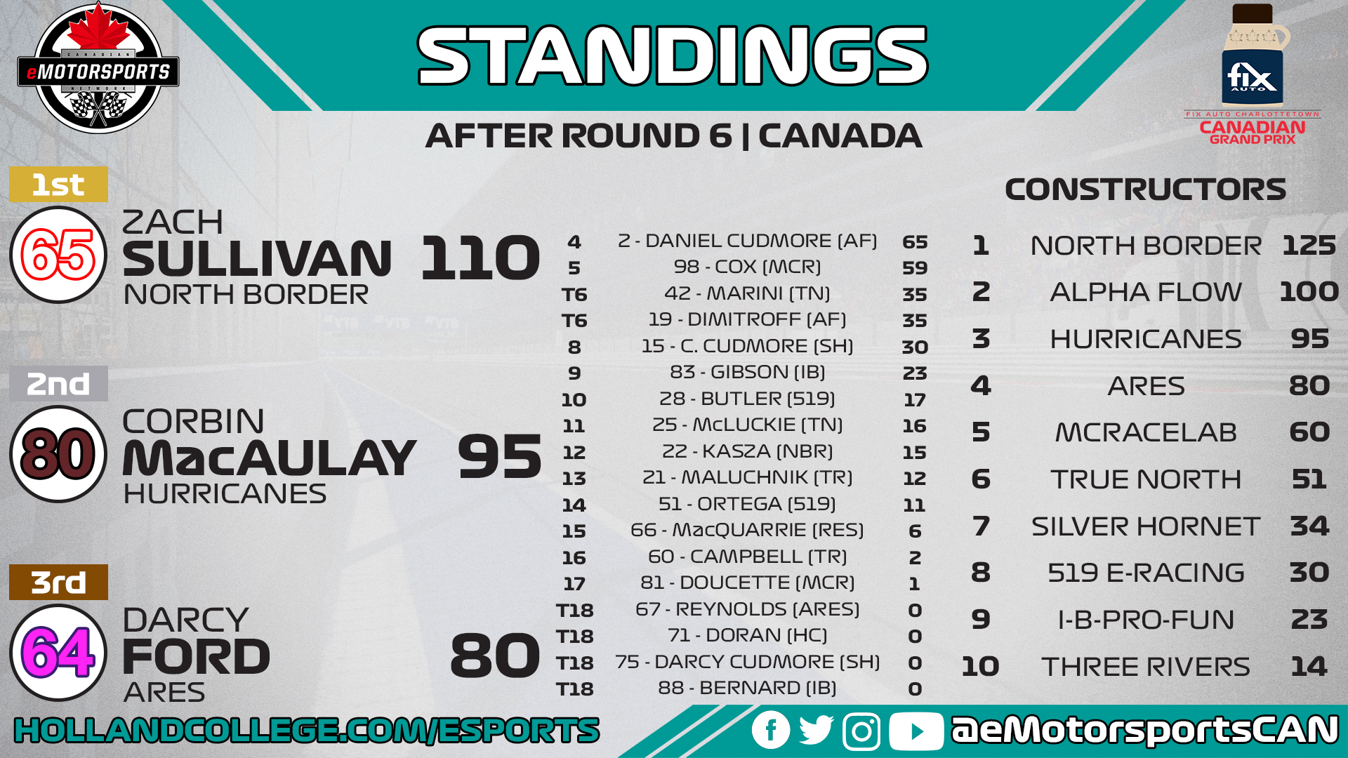 Meanwhile, North Border Racing continues to top the constructors table with 125 points after six races, good for a 25-point lead over second-place Alpha Flow F1 Racing, which still has its status as the only team to have both drivers claim points in every race this season.