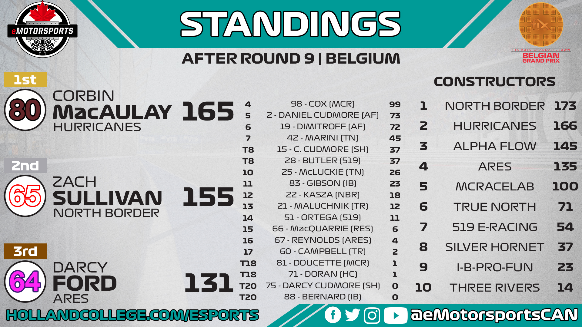 For the second consecutive week, safety cars played a role in the outcome at last week’s Fix Auto Belgian Grand Prix, where Corbin MacAulay drove through the field in an eventful race after qualifying 16th to capture his fifth victory of the season for Hurricanes eMotorsports.
