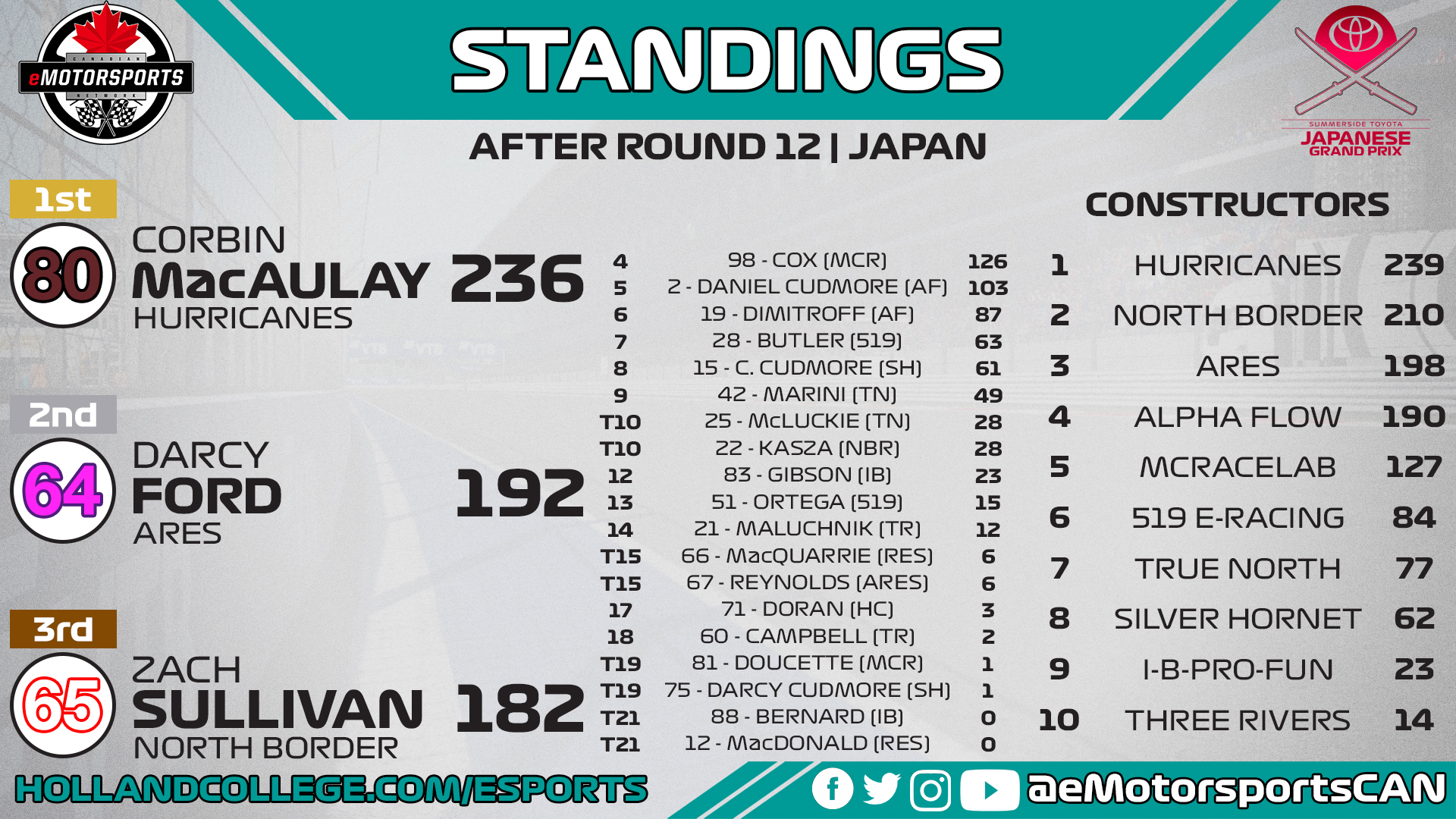 Corbin MacAulay of Hurricanes eMotorsports picked up his seventh victory of the season at the Summerside Toyota Japanese Grand Prix last week, extending his lead to 44 points over Darcy Ford of Ares Racing as he gets closer to clinching the championship.