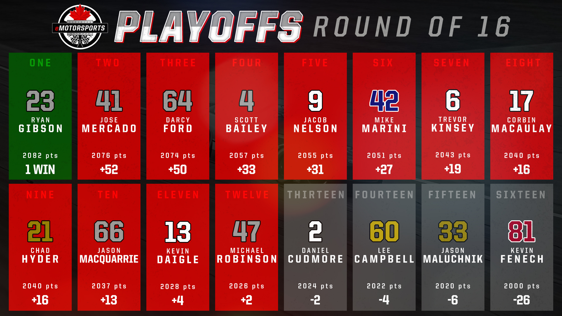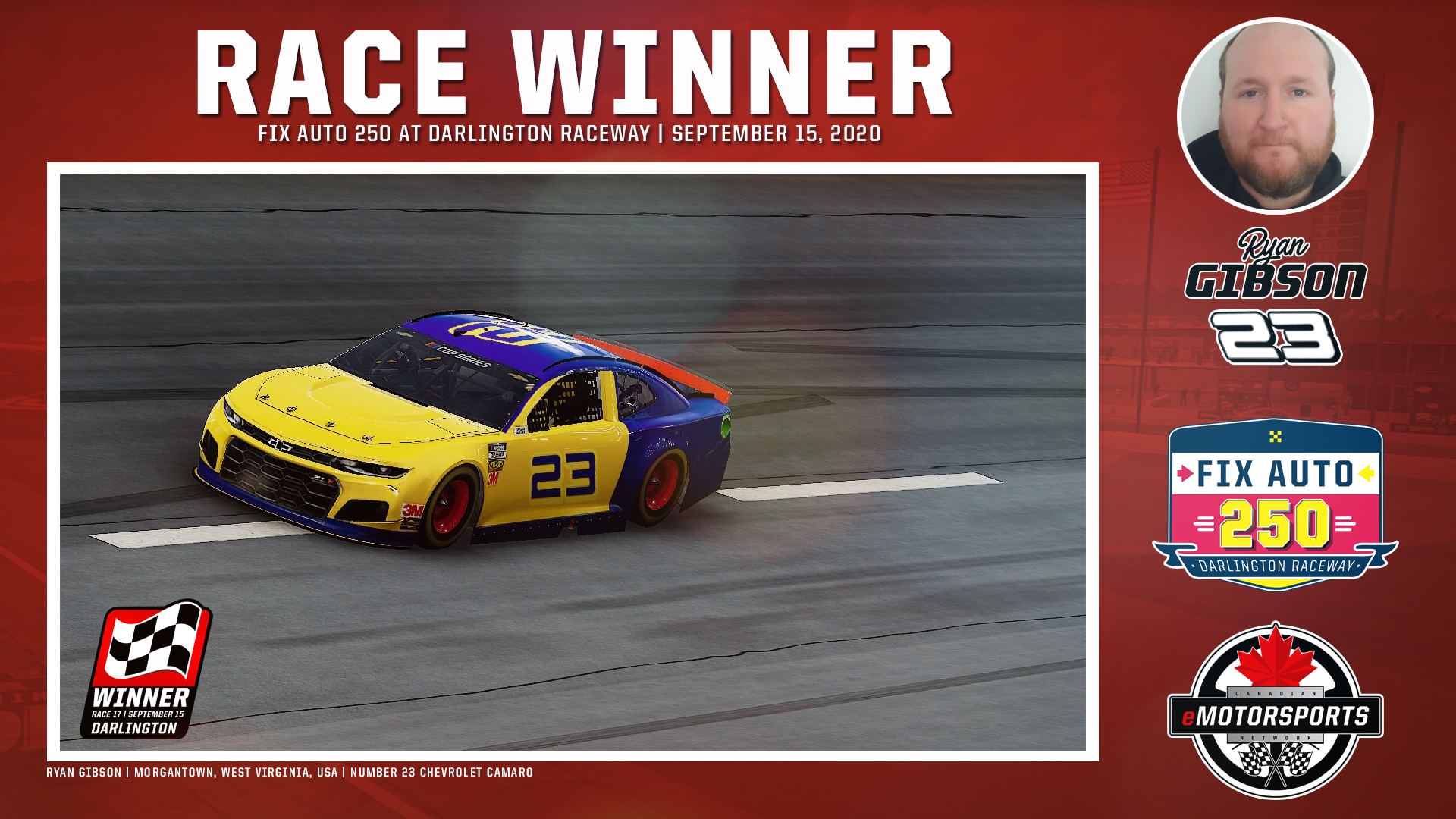 It was the perfect start to the playoffs for Ryan Gibson of Morgantown, West Virginia, USA, on Tuesday night when he won the Fix Auto 250 at Darlington Raceway; it was the first of three playoff races in the Round-of-16 for the Canadian eMotorsports Network NASCAR Series.