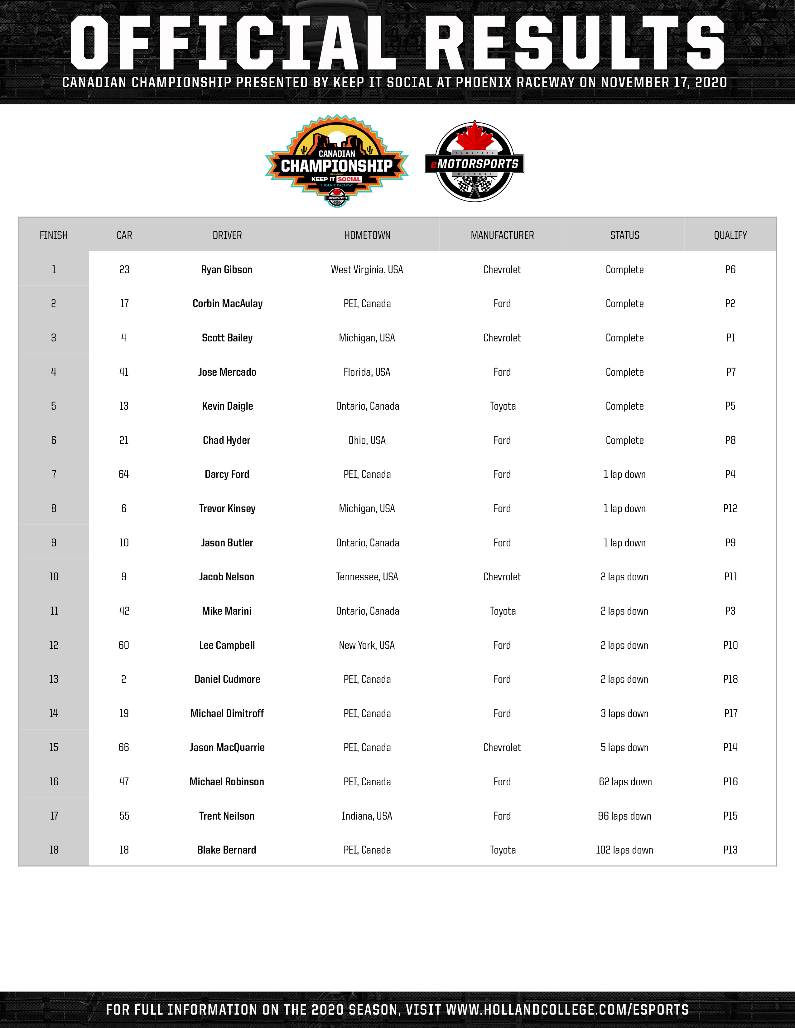 Ryan Gibson, of Morgantown, West Virginia, USA, picked up his sixth win of the season on Tuesday night, coming up clutch when needed; he outlasted his three playoff competitors to win the Canadian Championship presented by Keep It Social at the Phoenix Raceway. With the win, Gibson wins the inaugural Earl Ross Cup, awarded to the Canadian eMotorsports Network NASCAR Series champion.