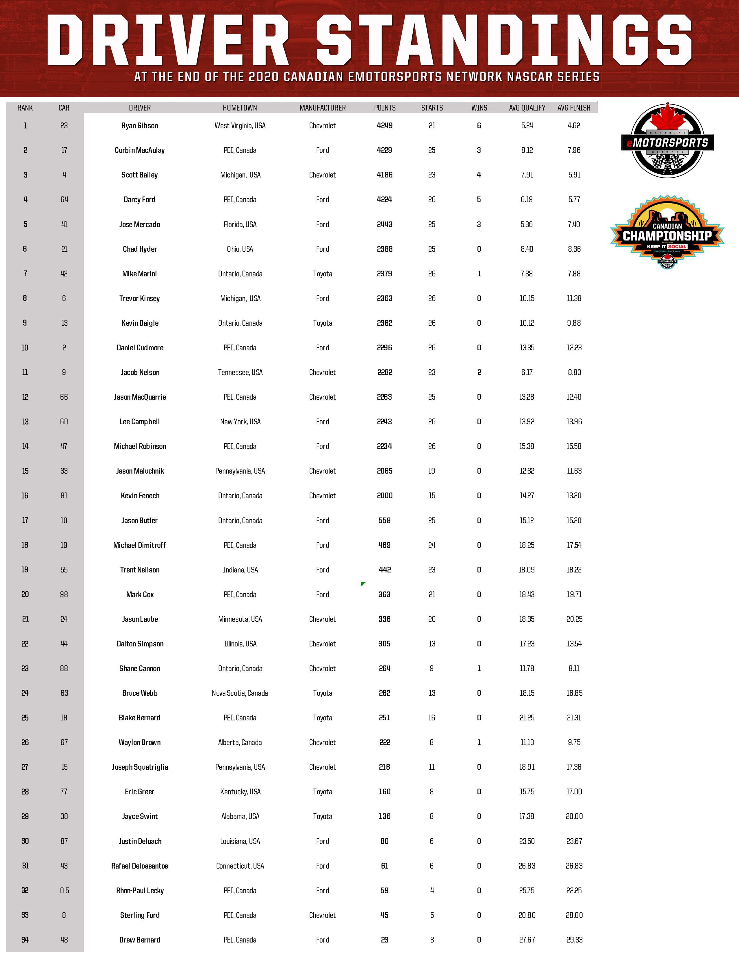 Here are the official driver standings for the 2020 Canadian eMotorsports Network NASCAR Series.