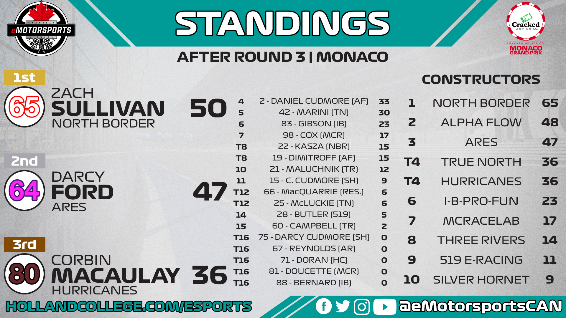 Following a seventh-place finish last week, North Border Racing’s Zach Sullivan has a three-point lead over Ares Racing driver Darcy Ford in the drivers’ standings, while MacAulay propelled himself up to third in the standings with his win.