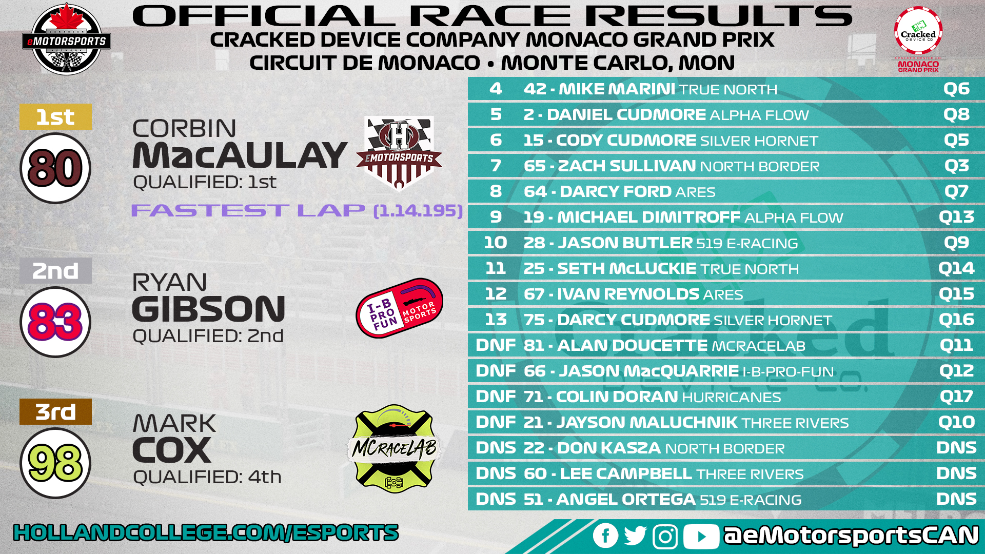 Here are the final results from the Cracked Device Co. Monaco Grand Prix on September 17.