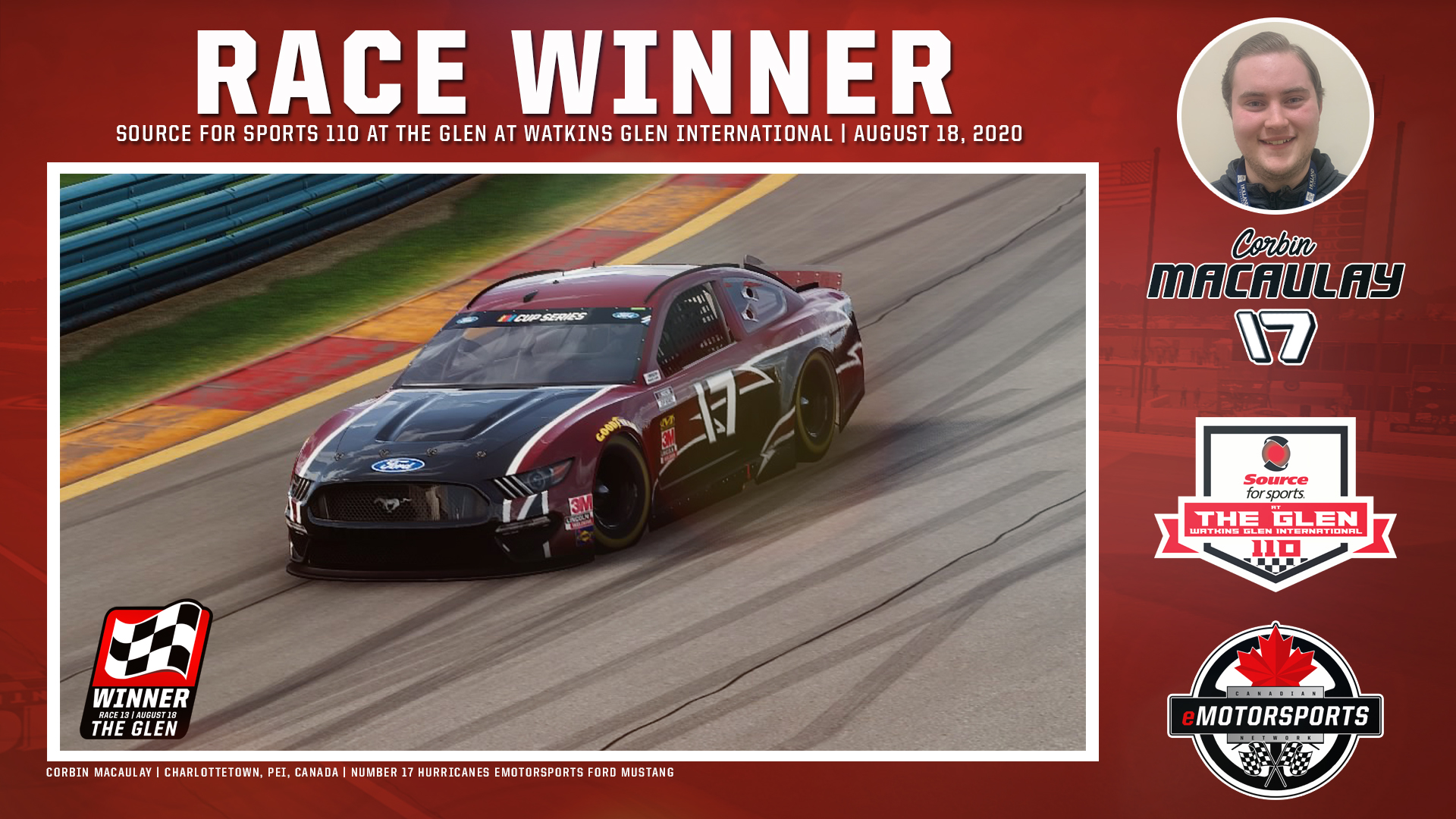 It was a dramatic race on Tuesday night at Watkins Glen International as Corbin MacAulay drove his number 17 Hurricanes eMotorsports Ford Mustang to victory lane for the first time.