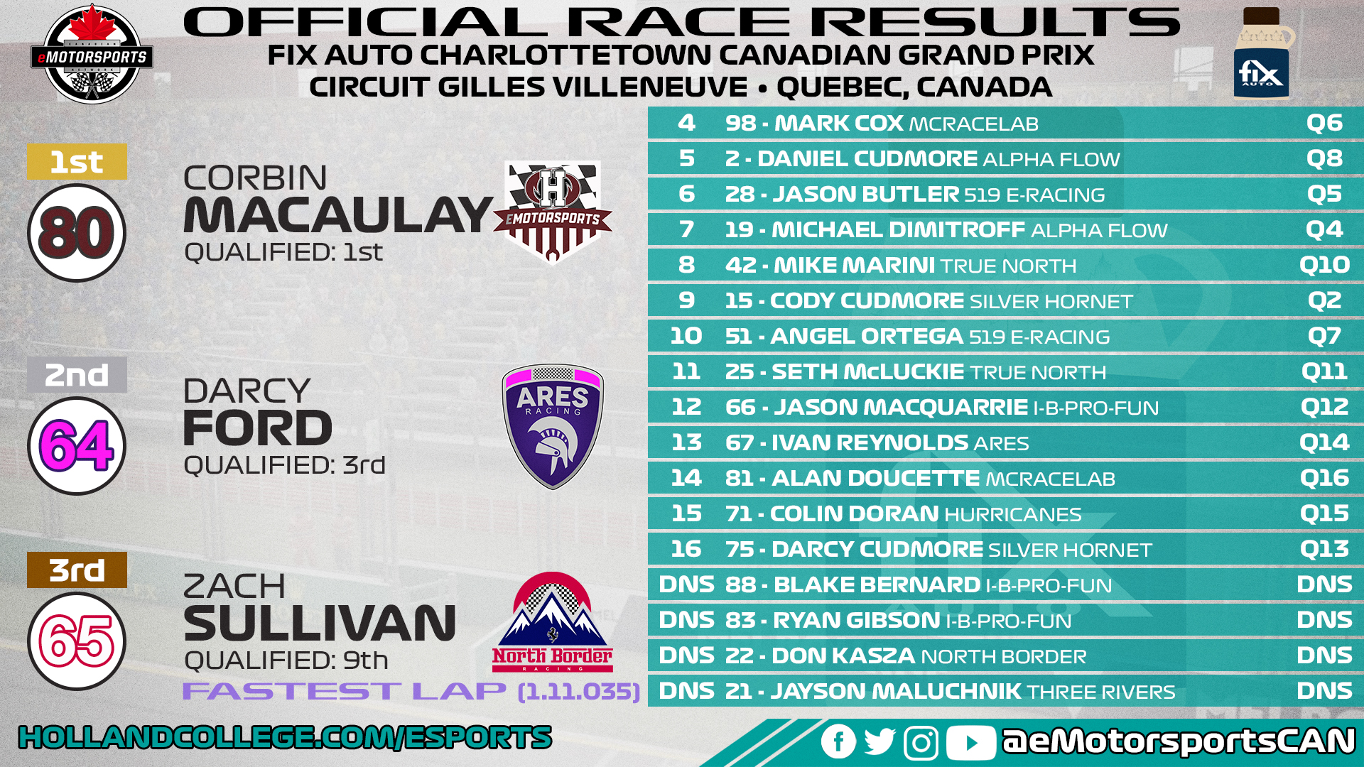 For more information on the Canadian eMotorsports Network, please visit hollandcollege.com/esports, and follow across social media @eMotorsportsCAN.