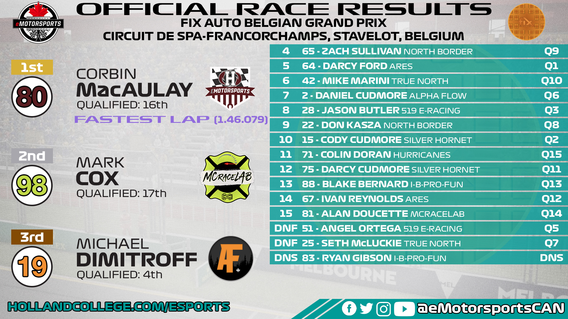 For more information on the Canadian eMotorsports Network, please visit hollandcollege.com/esports, and follow across social media @eMotorsportsCAN.
