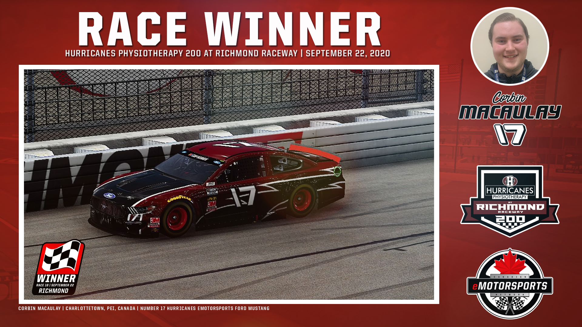 The Hurricanes Physiotherapy 200, the second playoff race in the Round-of-16 of the Canadian eMotorsports Network NASCAR Series, saw the Hurricanes eMotorsports driver claim his second win of the season, and punch his ticket to the Round-of-12 with the win; he joins Ryan Gibson who won last week at Darlington. The third driver to clinch his spot in the next round is Darcy Ford who now holds a 76-point cushion over the 13th place driver.
