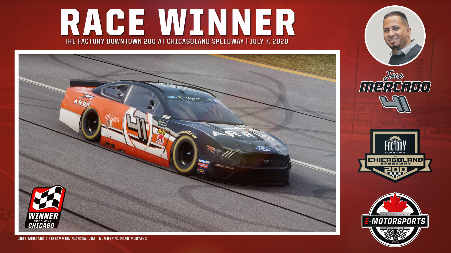 Jose Mercado found his groove early on at The Factory Downtown 200, starting third and eventually taking the lead midway through the second stage, never looking back en route to his first win of the regular season at the virtual-Chicagoland Speedway.