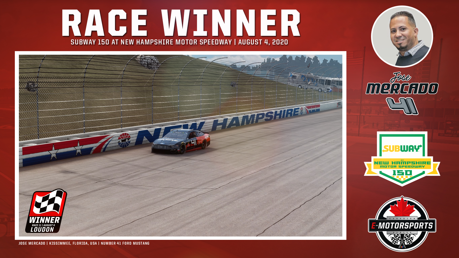 Jose Mercado went to victory lane on Tuesday night at the New Hampshire Motor Speedway, winning the Subway 150; this was the 11th race of the 2020 Canadian eMotorsports Network NASCAR series regular season.