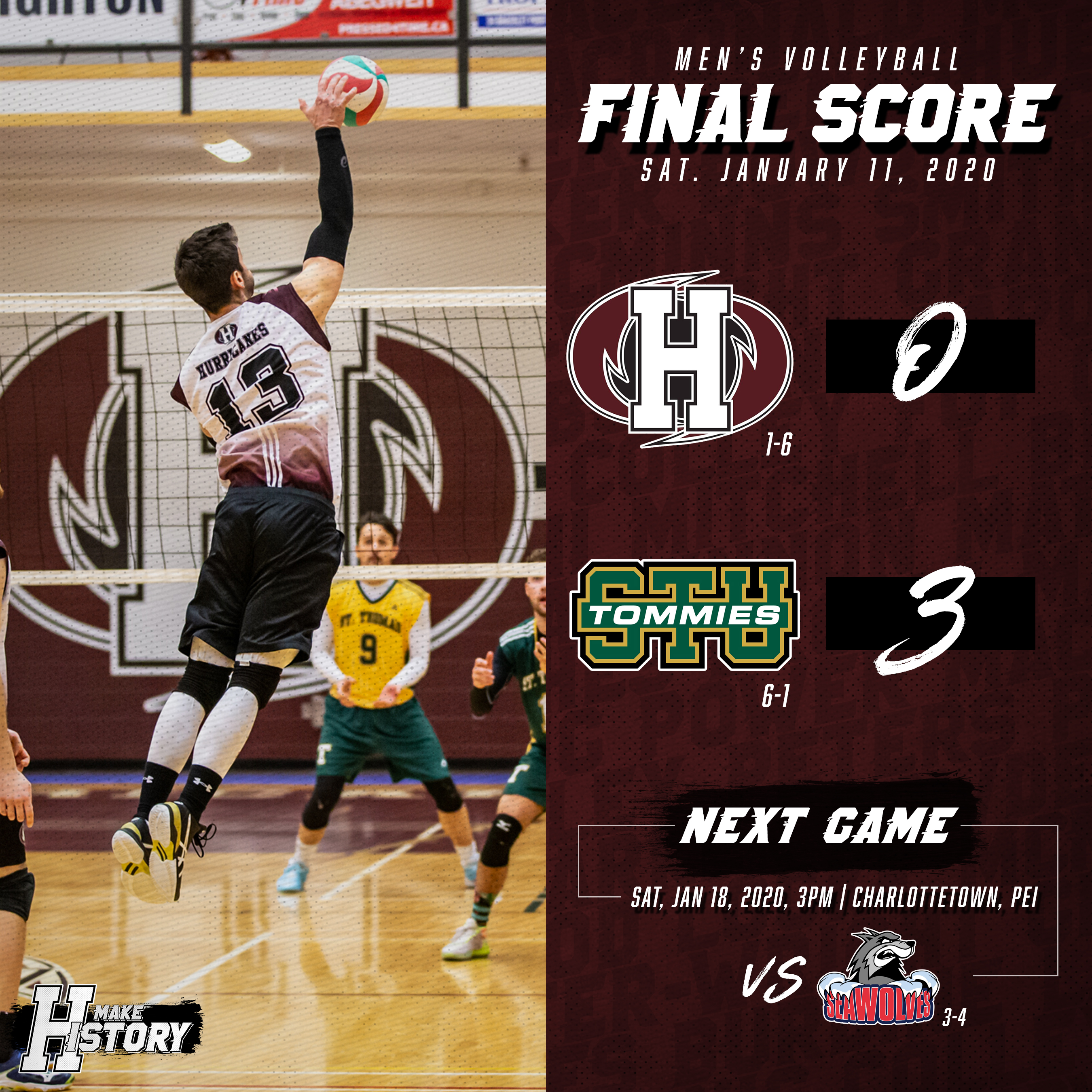 The Holland Hurricanes men’s volleyball teams lost in straight sets to the St. Thomas University (STU) Tommies on Saturday at the Holland College Centre for Community Engagement (CCE) in Charlottetown. This was the first match of 2020 for the Hurricanes in Atlantic Collegiate Athletic Association (ACAA) regular season action.