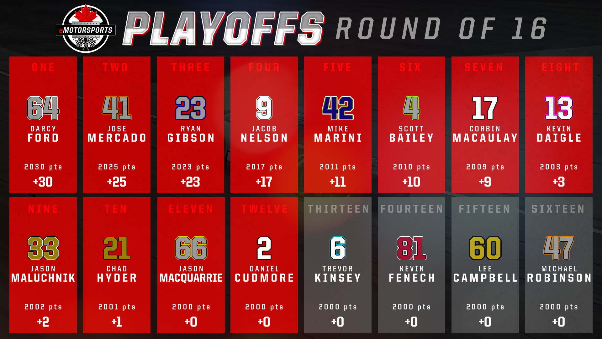 After 16 weeks of regular season races, it is now time to begin the 2020 Canadian eMotorsports Network NASCAR Series Playoffs. The “Round of 16” begins on Tuesday at the Darlington Raceway for the Fix Auto 250.