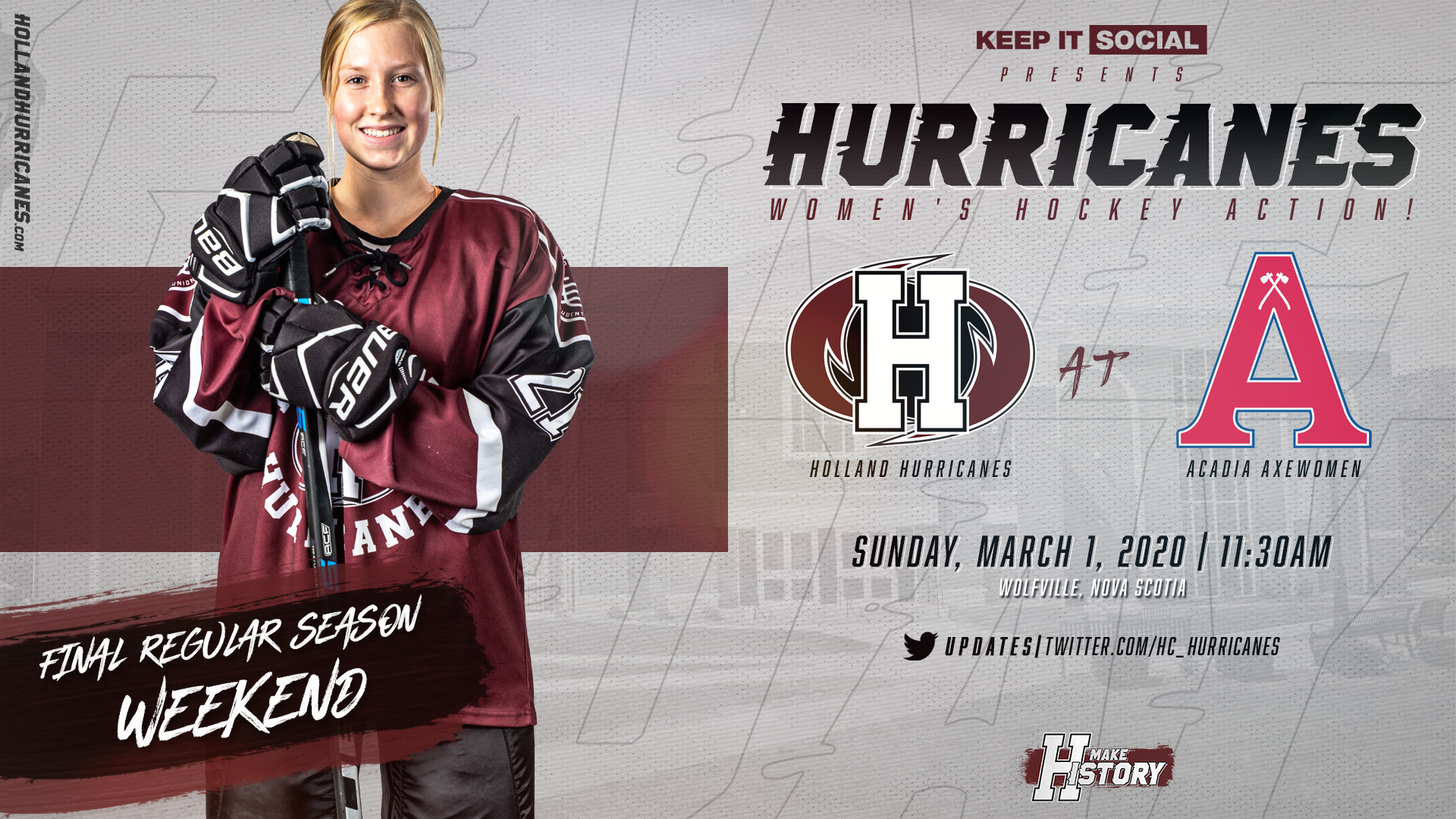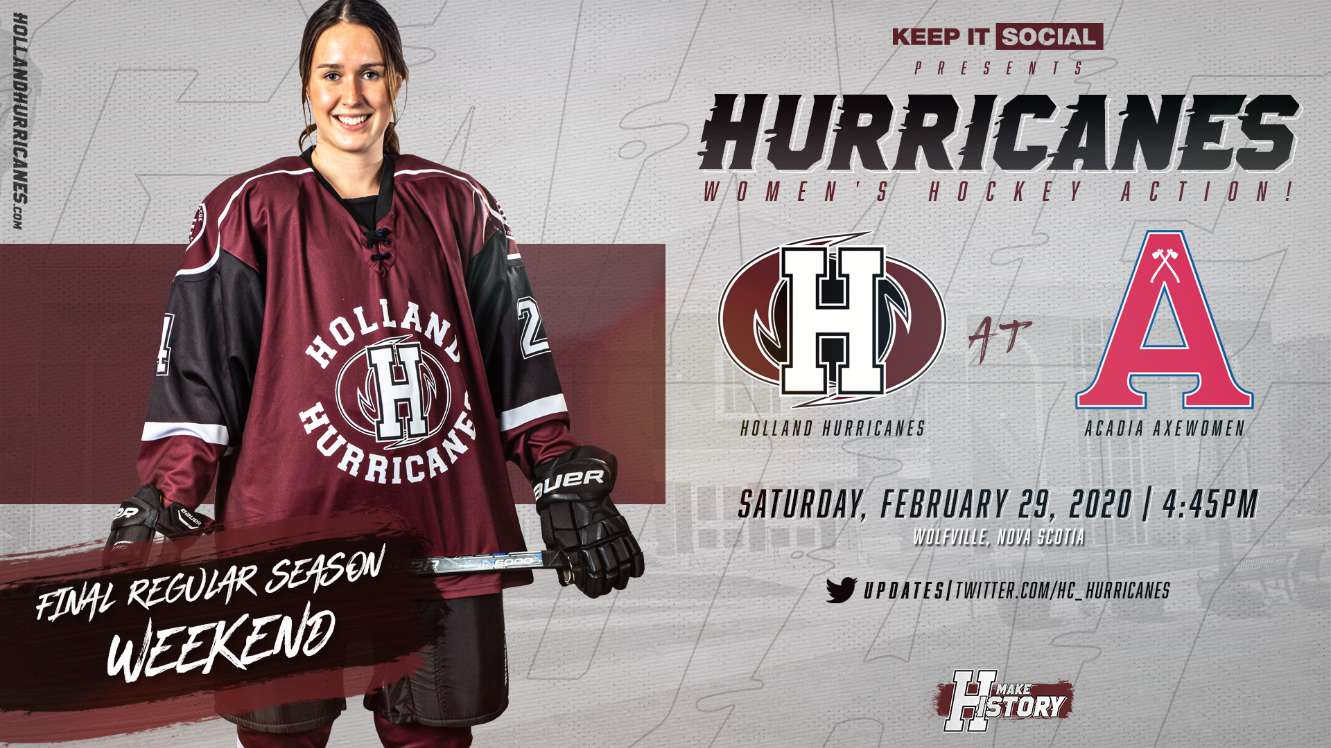 The Holland Hurricanes women’s hockey team hit the road this weekend to take on the Acadia University Axewomen in Wolfville, Nova Scotia to close out their 2019-20 Atlantic Collegiate Hockey Association (ACHA) regular season. Games take place at 4:45pm on Saturday and 11:30am on Sunday at the arena on the Acadia University campus.