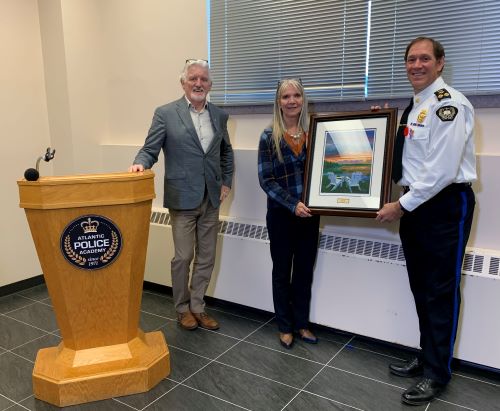 In this picture: Dr. Alexander (Sandy) MacDonald, left, and Forrest Spencer, executive director of the Atlantic Police Academy, present the Staff Excellence Award to Arlene Heffell.
