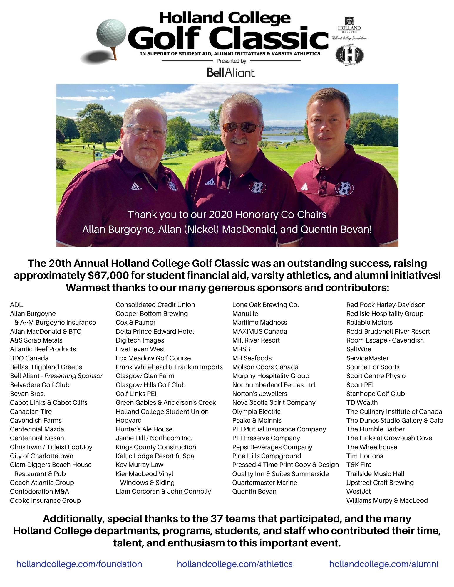 Holland College, the Holland College Foundation, and Holland Hurricanes hosted the 20th Annual Holland College Golf Classic, presented by Bell Aliant, on September 17 at Belvedere Golf Club.