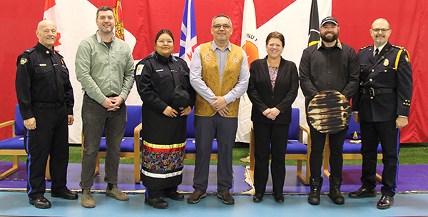 (L-R) Wayne Rudderham, learning manager, Atlantic Police Academy; Forrest McWade, Manager of Labrador Partnerships, Indigenous Services Canada; Jasmine Andrew, student speaker; Chief Eugene Hart, Sheshatshiu Innu First Nation; Patricia Shields, Vice President – Academic and Applied Research; Richard Lush, Lennox Island Elder; and Jeff Minten, Executive Director, Atlantic Police Academy.