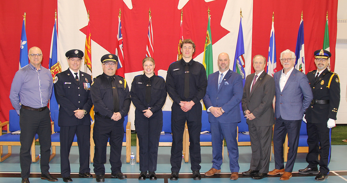 Professional Firefighter Squad 27 graduated in a ceremony at the Atlantic Police Academy recently: (L-R) Carl Chapman, Vice Chair of the Board of Governors, Holland College; Firefighter Duane Farrell, Charlottetown Fire Department, guest speaker; Captain Johnny Dugay, Coordinator, Professional Firefighter program; Hannah Hicks, graduate; Niels Vincent, graduate and student speaker, and recipient of the Maritime Fire Chief’s Association Award; Tyler DesRoches, MLA District 21 Summerside/Wilmot; The Honourable Robert J. Morrissey, Member of Parliament for Egmont; Dr. Alexander (Sandy) MacDonald, President and CEO, Holland College; Executive Director Jeff Minten, Atlantic Police Academy.