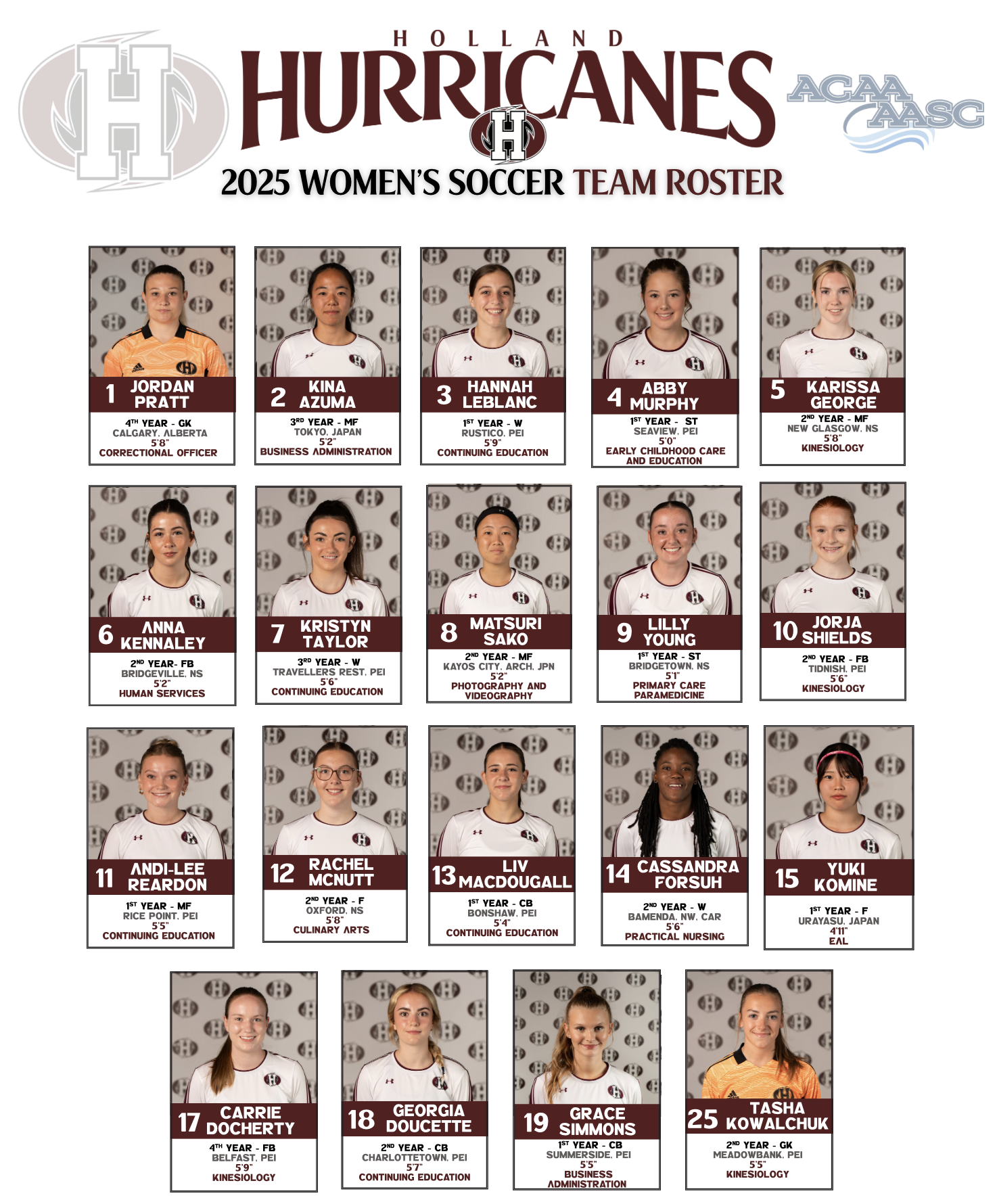 Holland Hurricanes women's soccer are seven-time ACAA Champions (2008, 2010, 2013, 2016, 2019, 2021, 2023) the 2023 CCAA National Bronze Medallists, as well as hosts of the CCAA nationals in 2012 and 2023.