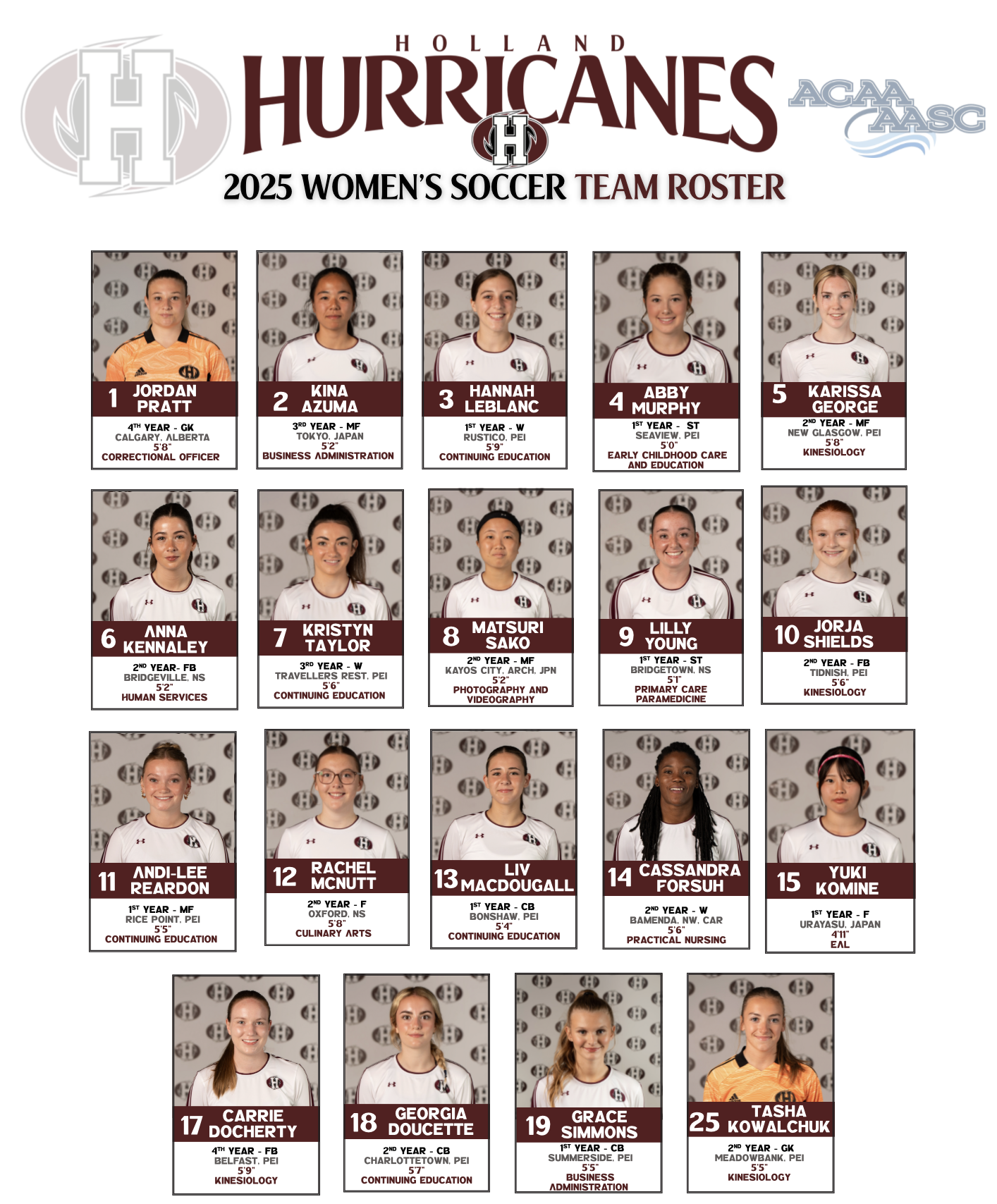Holland Hurricanes women's soccer are seven-time ACAA Champions (2008, 2010, 2013, 2016, 2019, 2021, 2023) the 2023 CCAA National Bronze Medallists, as well as hosts of the CCAA nationals in 2012 and 2023.