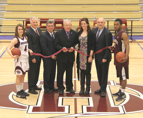 In this picture: (L-R) Hurricanes athlete Lindsay Shupe, college vice president Michael O’Grady, MLA Richard Brown, City of Charlottetown deputy mayor Stu MacFadyen, student union president Jessica Wakelin, college president Dr. Brian McMillan, and Hurricanes athlete Alvin Parker prepare to cut the ribbon to officially open Holland College’s new Centre for Community Engagement.