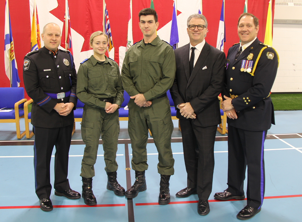 Students in the 18-week Conservation Enforcement program graduated in a ceremony at the Atlantic Police Academy in Slemon Park recently. (L-R) Guest speaker Jason McGinn, Director, Department of Fisheries and Land Resources, Government of Newfoundland and Labrador; Kendra Rioux, student speaker; graduating student Jordan Allen; Doug Currie, Holland College Vice President, Corporate Services; and Forrest Spencer, Executive Director, Atlantic Police Academy.