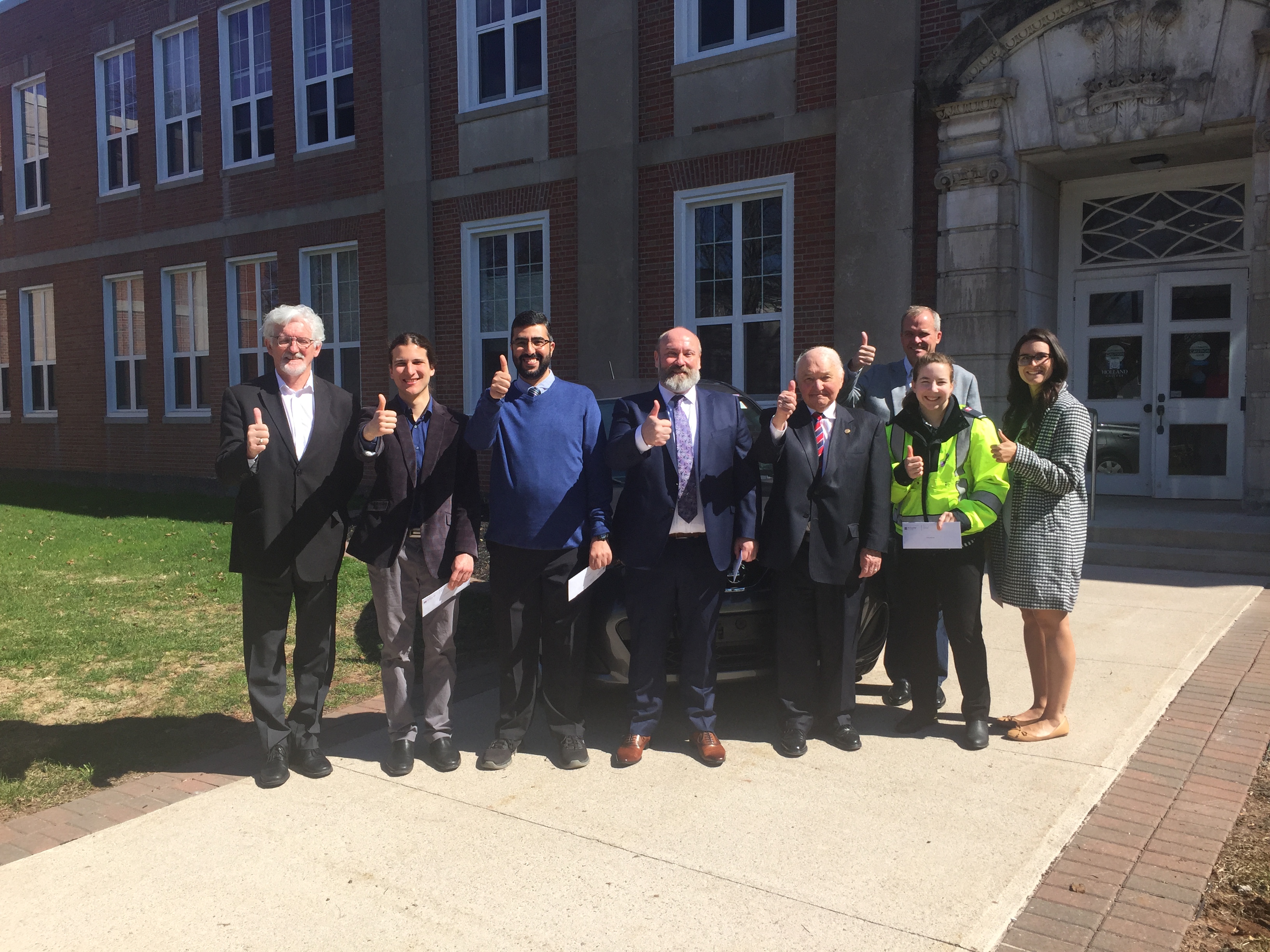 Thumbs up from (L-R) Holland College president Sandy MacDonald, student finalists Luis Anselmi, Amin Abomonasar, Aaron King, donor Lou MacEachern, Holland College Foundation board member Kent Scales, and student finalists Emily Stolzman and Alison Winters.