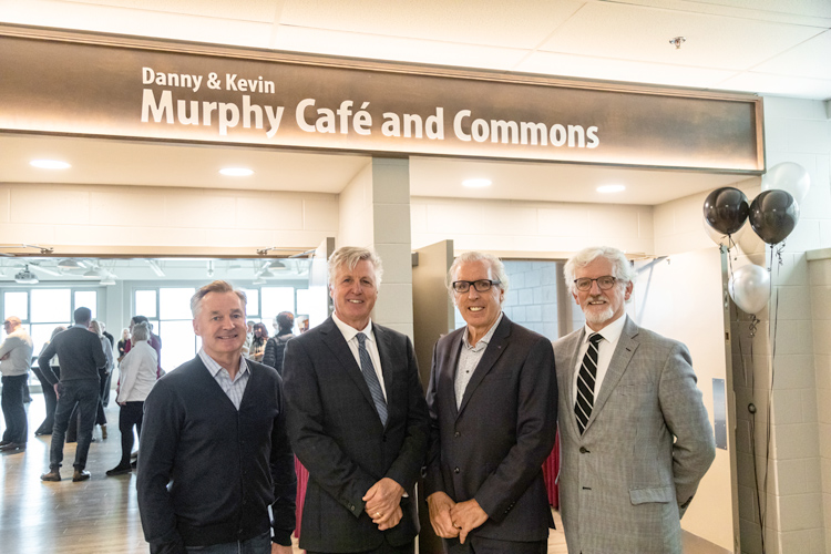 In this picture: Holland College Foundation Board Chair Ron Keefe (left) and Holland College President Dr. Sandy MacDonald (right), congratulate leadership donors Danny and Kevin Murphy (centre) on the naming of the Danny & Kevin Murphy Café and Commons at the college’s Tourism and Culinary Centre. (Photo courtesy Al Douglas)
